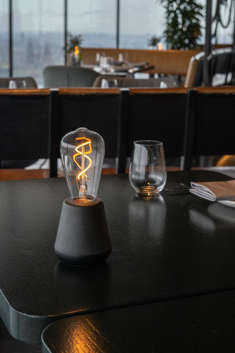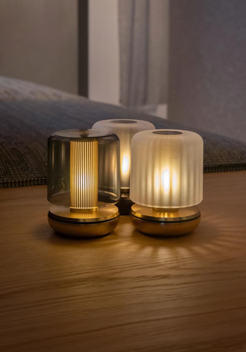 Door op de knop aan de onderkant te drukken, kunt u de helderheid van de lamp wijzigen in (1) kaars, (2) omgevings- of (3) werk.